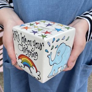 Personalised Large Cube Money Box- rainbow, elephant and scattered stars design
