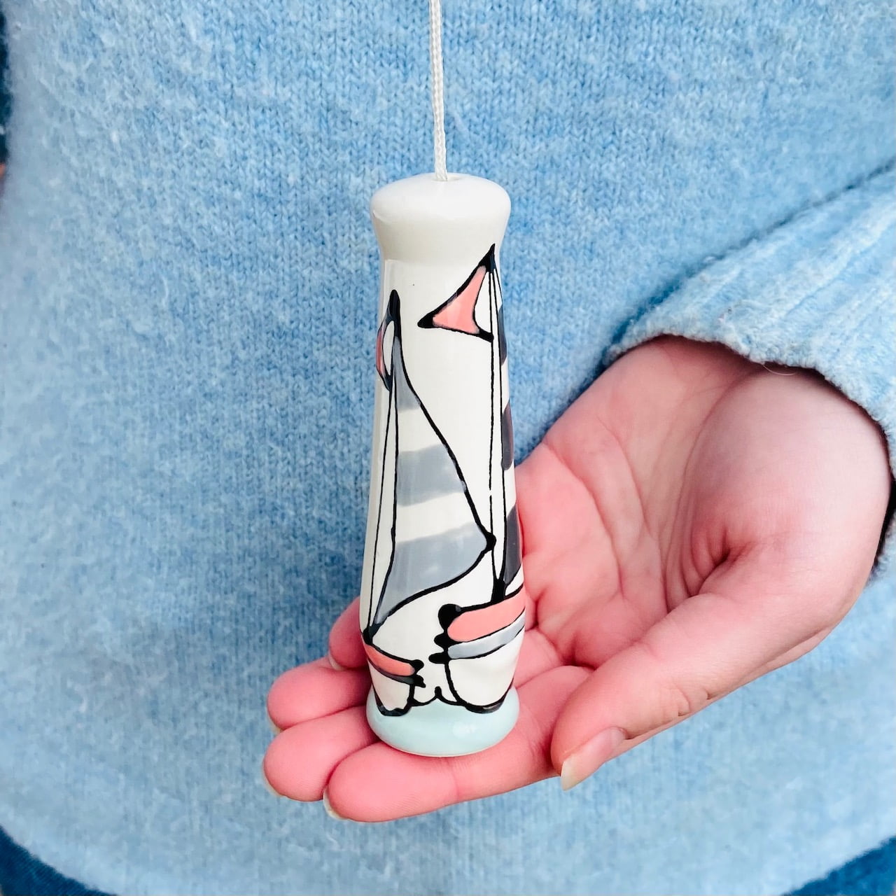 This photo shows an example of a personalised light pull with a blue beach and orange hut design.