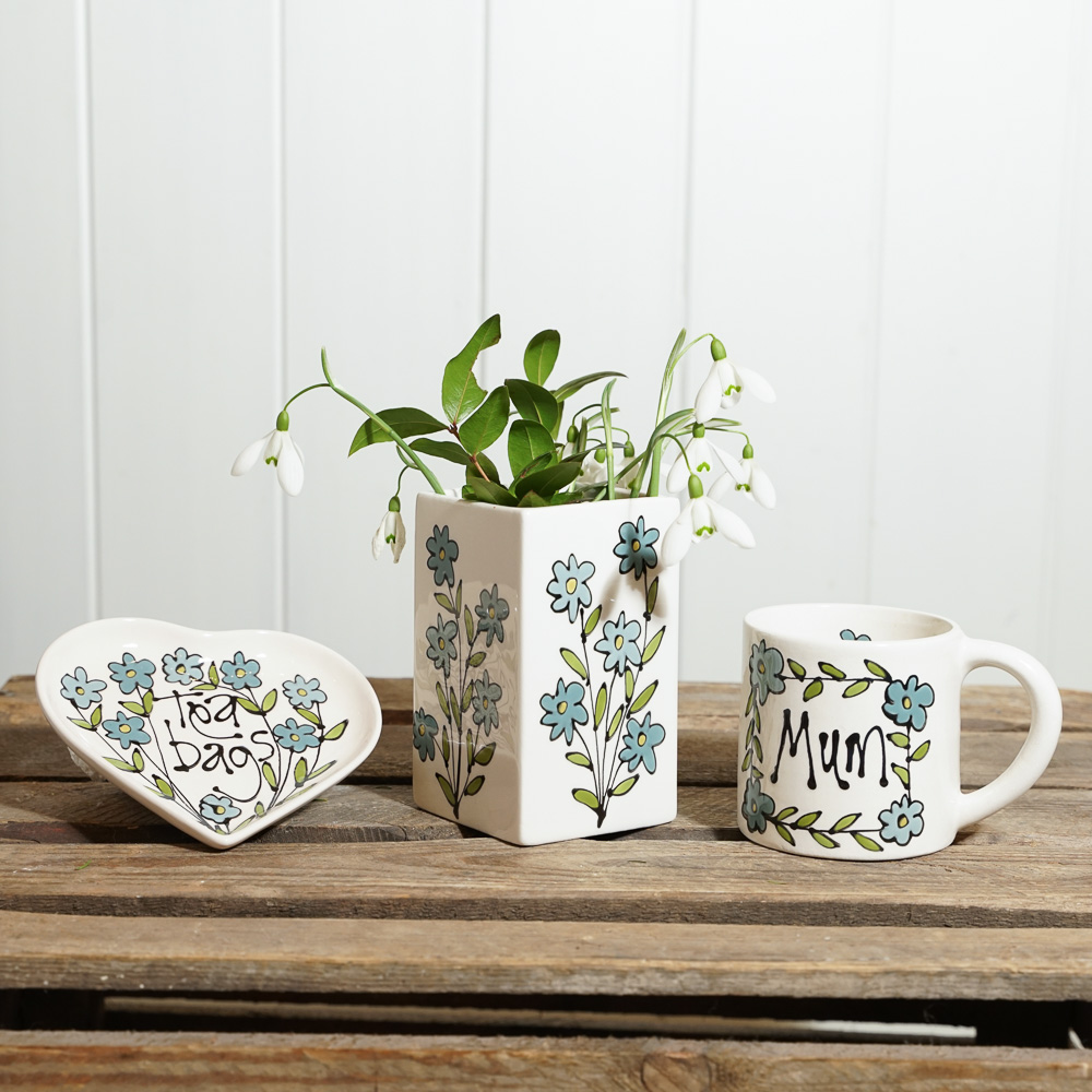 A small mug and heart-shaped tea-bag dish are also available with matching forget-me-not designs.