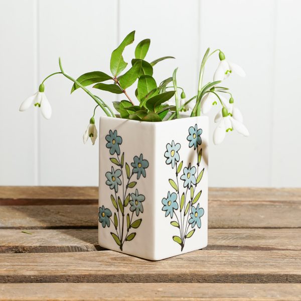 This hand-painted ceramic cube vase is decorated with a pretty design of forget-me-not flowers.