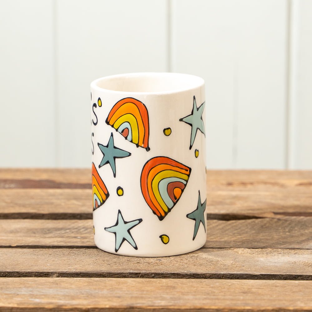This gift is useful, decorative and will help Dad keep track of his pens! It is made from hand-painted ceramic and decorated with rainbows, stars and hearts.
