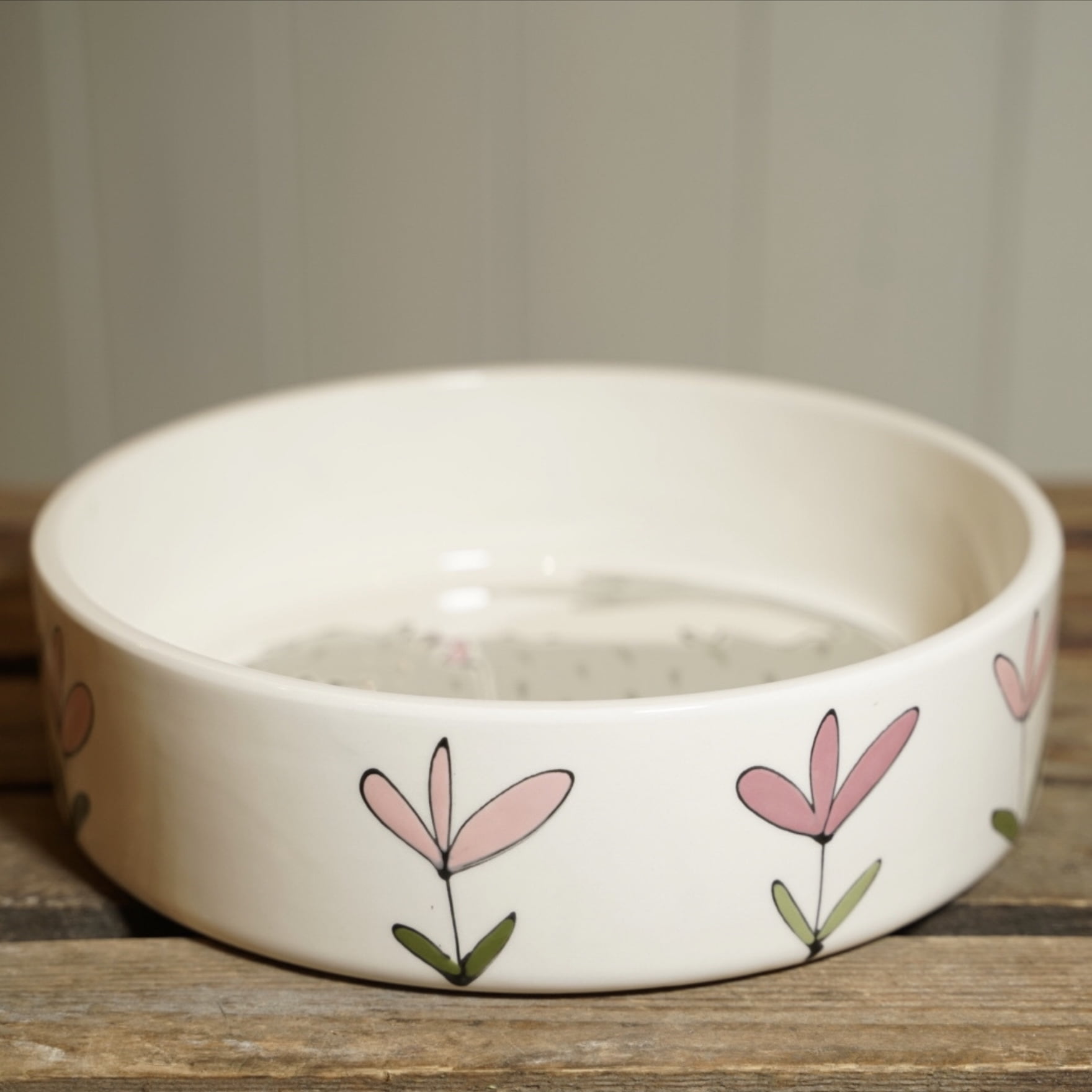 A medium-sized straight-sided dog bowl with delightful grey scruffy dog with motifs of grass and pink flowers